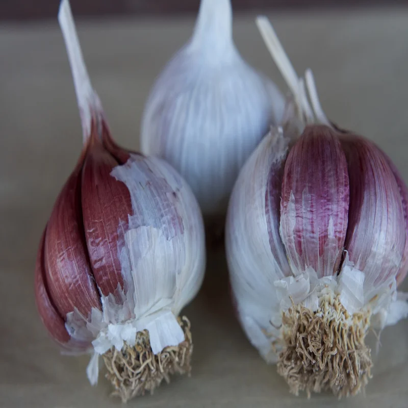 Bulbs are rounded and globe-shaped, typically measuring 4.5 to 6 cm across, with a convex base and tightly wrapped white skins that protect the cloves during long storage. Each bulb contains 11 to 14 cloves, arranged in one or two layers. Some inner cloves are enclosed in a second skin, adding to its visual intrigue and structural integrity. The cloves themselves are tall and slender, with sharply angled inner surfaces and skins ranging from purple-red to bronze, often streaked with cream at the base.